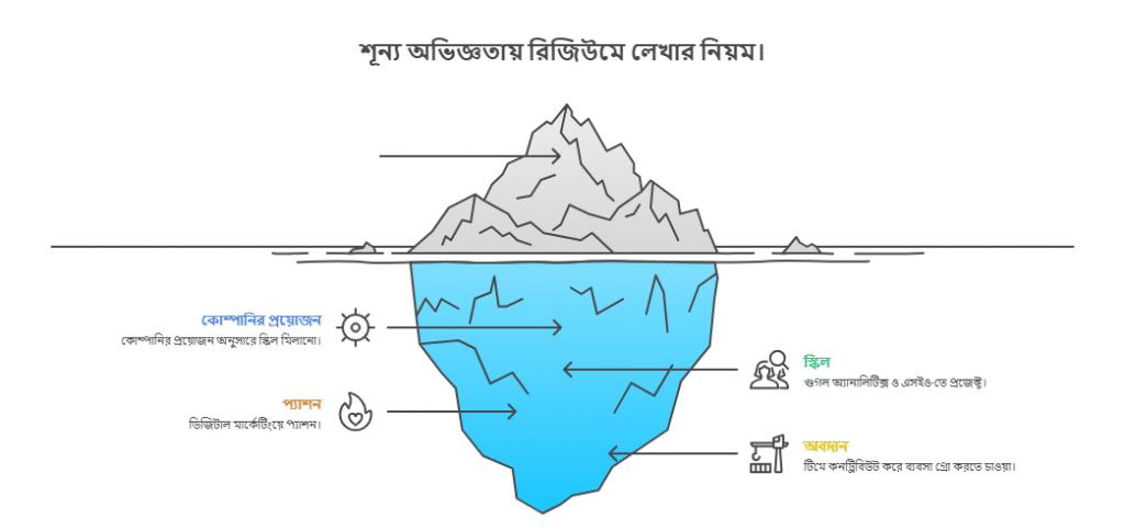 অনেকে লেখে “যেকোনো জব চাই”। এটা ভুল। শূন্য অভিজ্ঞতায় রিজিউমে লেখার নিয়ম হলো – অবজেক্টিভে কোম্পানির প্রয়োজনের সাথে আপনার স্কিল মিলিয়ে লিখুন।